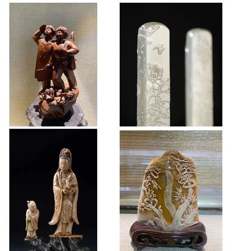林昊给我看他收藏的林清卿的薄意精品《花卉对章》、周尚均的《梅兰竹菊》博古纹四对印章、林元珠的《海潮观音》、陈巨来篆刻的《休说前事》印章。这些精品古朴自然,包浆浑厚,大巧若拙,雕刻极为生动。对精品寿山石的独特之爱和广泛涉猎,让林昊对家乡的 “天遣瑰宝” 每隔一段时间总有新的认识。众所周知,寿山石是世间 “尤物”,寿山石的原石,因为它的质地、颜色、光泽和纹路等,极具欣赏和收藏价值,特别是名家雕制而成的寿山石更有非常高的欣赏和收藏价值。“把玩” 是中国所独有的历史悠远的文化现象,而温润凝腻的寿山石无疑是最佳的把玩对象。由于林昊自己就是寿山石雕刻好手,因此他对寿山石的判断基本上都是准确的。他至今依然觉得,有时好东西会等自己。有一次,他在网站上看到美国费城的一家拍卖行有一件田黄精品,但又觉得像蜜蜡,犹豫不决。在与对方多次交流沟通后,对方告诉他是燥石,由此他基本断定是寿山石,于是二话没说,便买了一张机票飞到美国纽约。之后连时差都还没倒过来,便叫朋友开车将他从纽约送到费城。当时有很多华人买家也在现场,林昊扫了一眼,发现大多藏家都不是玩寿山石的,于是气定神闲,志在必得。但正式拍卖开始时,有五位委托人举牌,这下林昊有点心虚。在两万八美金的价位上,林昊举牌时,委托方由于有一定限制,无法再举牌,林昊有惊无险地抱得 “美人” 归。这块硕大的田黄是 1963 年由原主人的祖父传给他的,品相极好,有晶莹剔透的 “萝卜丝”,如今成了林昊的 “宝贝” 之一。